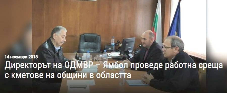 Директорът на ОДМВР – Ямбол старши комисар Генчо Иванов проведе работна среща с кметове на общини на територията на областта. В рамките на срещата беше обсъдена координацията между институциите при постъпили уведомления за провеждане на прояви по Закона за събранията, митингите и манифестациите. Обсъдени бяха и начините на взаимодействие при постъпване на сигнали за провеждане на нерегламентирани протестни прояви и нарушаване на обществения ред.