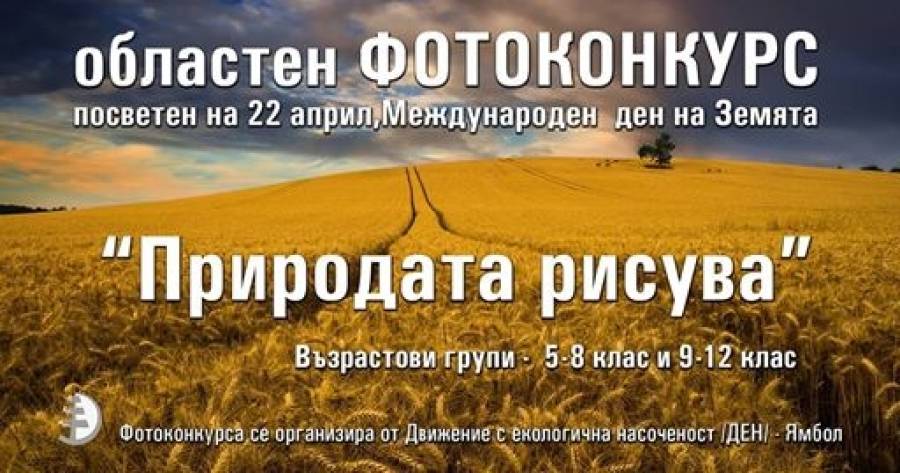 посветен на 22 април,Международен ден на Земята. Възрастови групи - 5-8 клас; и 9-12 клас. Фотографиите трябва да са уловили различни природни картини или детайли. Пейзажи, фрагменти от пейзажи, детайли от растения. Технически изисквания : формат - .jpg, не по-малко от 2000 pixela по дългата страна на изображението. Да се изпращат на Този имейл адрес е защитен от спам ботове. Трябва да имате пусната JavaScript поддръжка, за да го видите. Фотографии се приемат до 19 май 2019 г. до 18:00 часа. Всяка възрастова група ще има по три призови места, както и поощрителни награди. Първа награда - 100 лв., втора награда - 50 лв. и трета награда - 30 лв. На 22 май 2019 г. от 18:00 часа ще се открие изложба с най-достойните фотографии които журито ще класира. Изложбата ще се открие във фоаето на НЧ "Съгласие 1862" Ямбол.