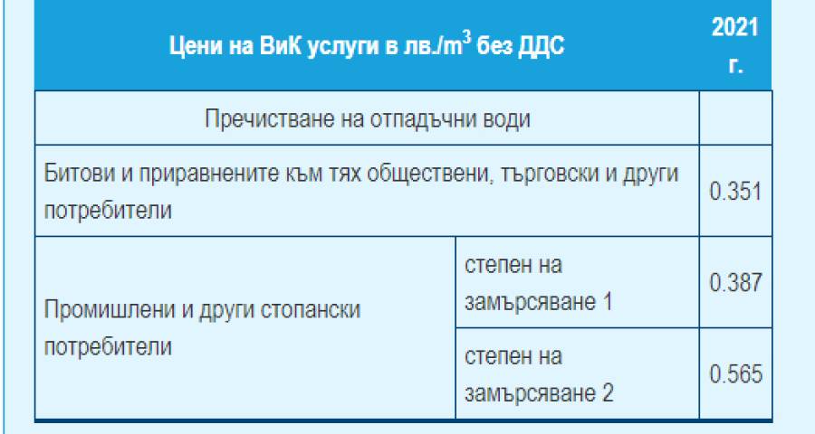 Считано от 01.08.2021год. на потребителите в град Ямбол да се начислява за В и К услугата „Пречистване на отпадъчни води“ следната цена /вж таблицата/