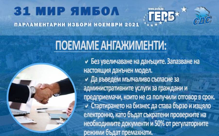 От ГЕРБ-СДС гарантират в следващия управленски мандат да няма увеличаване на данъците и запазване на настоящия данъчен модел. По отношение на гражданите и бизнеса ангажиментите са въвеждане на мълчаливо съгласие за административните услуги за граждани и предприемачи, които не са получили отговор в срок. Стартирането на бизнес да става бързо и изцяло електронно, като бъдат съкратени проверките на необходимите документи и 50% от регулаторните режими бъдат премахнати, е друг основен ангажимент.