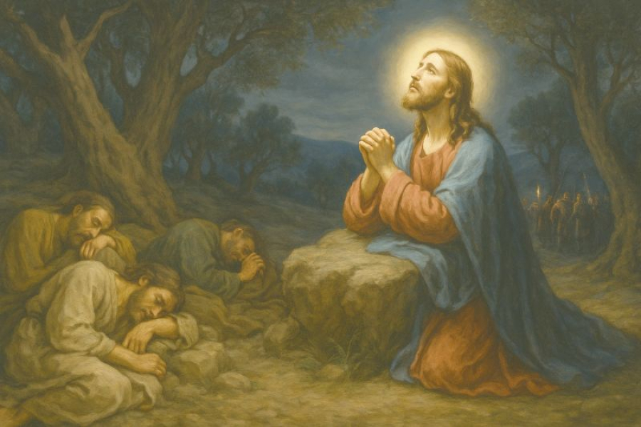 В Гетсиманската градина, под сребристия блясък на маслиновите дървета, настава часът на най-дълбоката самота. "Душата Ми е прескръбна до смърт; останете тук и бдете с Мене." Но учениците не издържат – сънят ги надвива, докато на няколко крачки от тях Синът Човешки води най-тежката битка.
