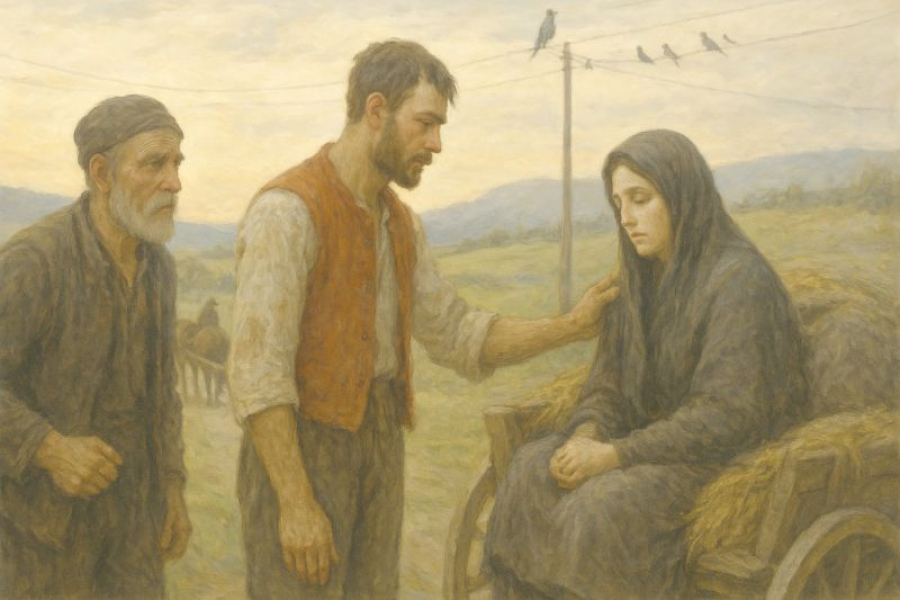 Той дълго стоя на шосето и гледа подир каруцата. Гледаше майката с черния й чумбер, момичето легнало до нея, високият селянин, който крачеше прегърбен и водеше малкото конче, а над тях, между всеки два телеграфни стълба лястовичките се разхвърчаваха, после пак се връщаха и кацаха на жицата.
