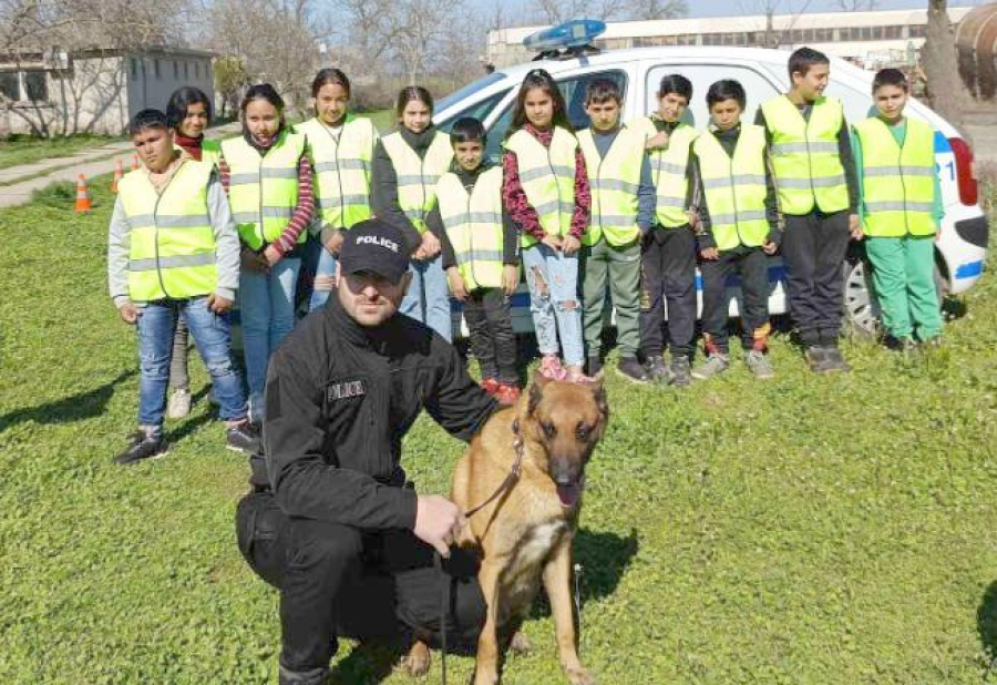 Младите доброволци бяха посрещнати от служителите на отделение „Водачи на служебни кучета“ при ОДМВР - Ямбол и от служебните кучета Лорд, Норд и Нико. На терен учениците се запознаха с работата на полицейските кучета, начините за дресирането им, процеса за придобиване на умения, както и че се обучават за различни специфични дейности, което ги определя по вид - постови, следови, за откриване на наркотици, за откриване на взривове и други. С голям интерес петокласниците наблюдаваха демонстративните изпълнения на трите служебните кучета, които водени от мл. експерт Янков и мл.инспектор Кирилов показаха елементи от обща дресировка - изпълнение на гласови и жестови команди, послушание, откриване на наркотик и задържане на нарушител.