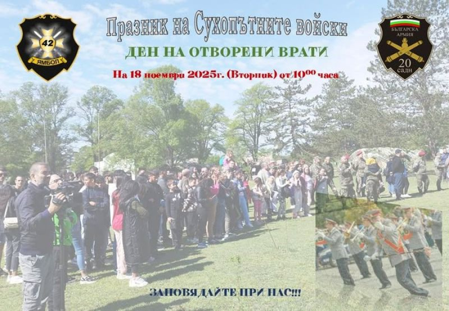 На 18.11.2025г. (вторник), от 10.00 часа, 42 механизиран батальон – Ямбол и 20 самоходен артилерийски дивизион отварят вратите си за обществеността по случай 19 ноември – Празник на Сухопътните войски.