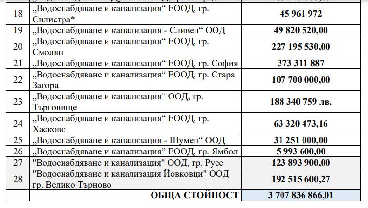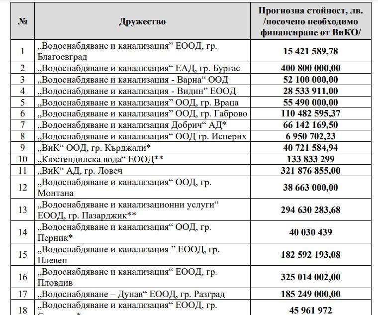 Общо необходимите средства за всички ВиК- та са 3.7 млрд лв.