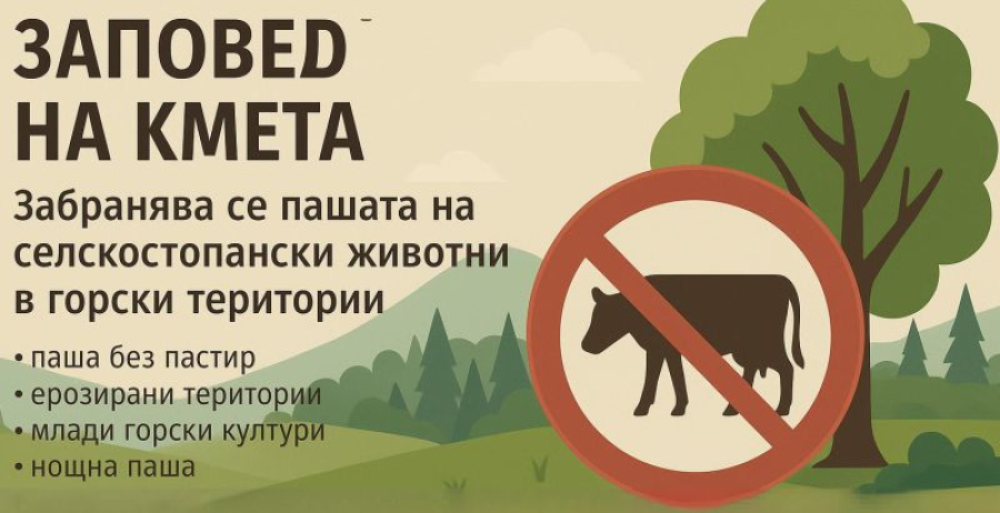 Кметът на община Ямбол издаде заповед № РД‑02‑00165 от 12.02.2025 г., с която се въвеждат ограничения за пашата на селскостопански животни в горски територии на територията на общината през 2026 г. Заповедта е издадена по искане на ТП „Държавно ловно стопанство Тунджа“ и на основание Закона за местното самоуправление и Закона за горите.