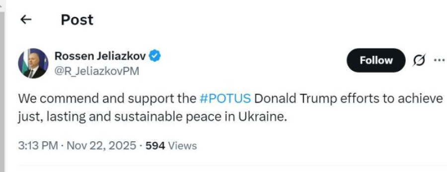 Приветстваме и подкрепяме усилията на президента на САЩ Доналд Тръмп за постигане на справедлив, траен и устойчив мир в Украйна, заяви премиерът Росен Желязков